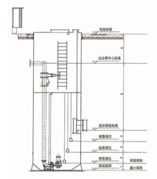 泵站主体主要由玻璃钢井筒、潜水排污泵、格栅系统、提升链、管道、阀门、液位传感器、控制系统和通风系统、进出水软接头等部件组成。